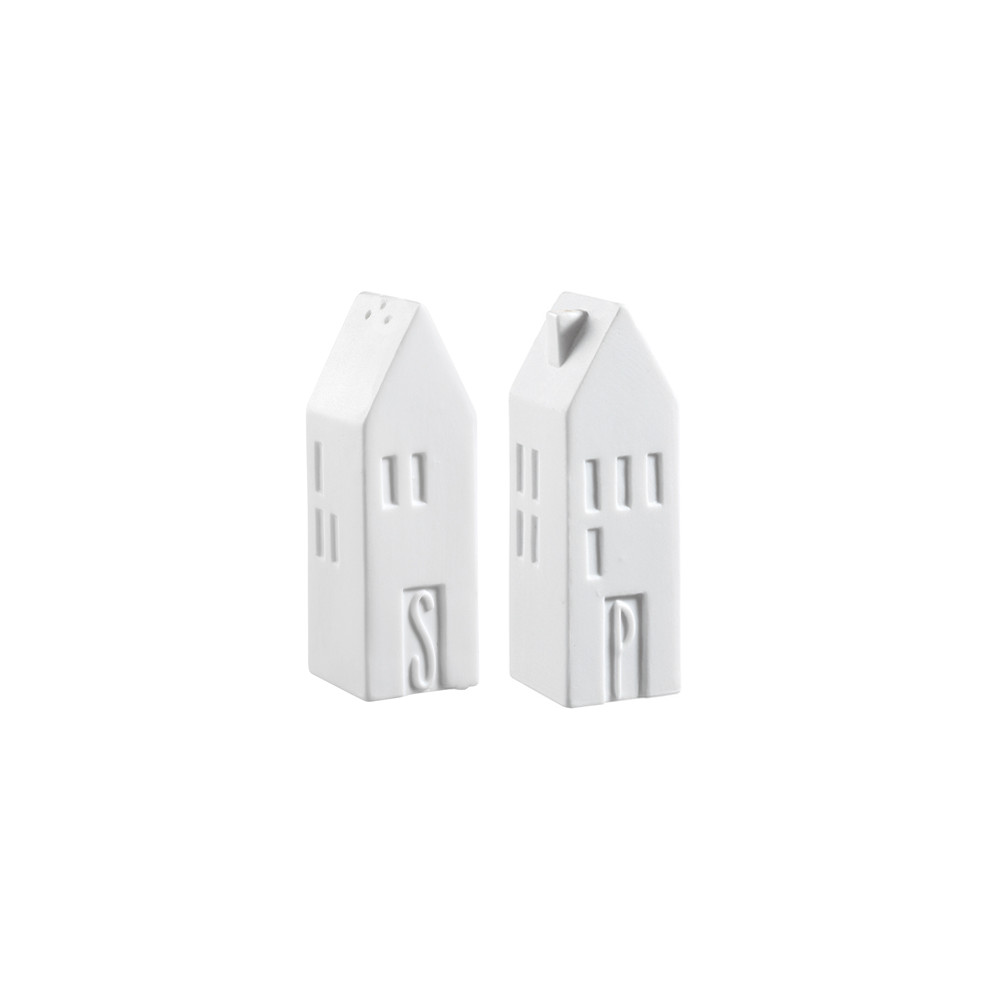 Ensemble salière et poivrière en porcelaine, en forme de petites maisons.
